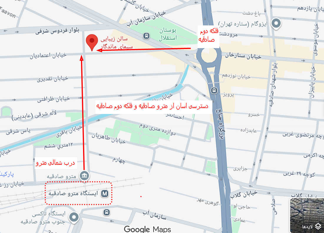 دسترسی از مترو صادقیه : خروجی شمالی متروصادقیه، خیابن ولیعصر، تقاطع اعتمادیان و ولیعصر(دسترسی آسان از مترو صادقیه)
